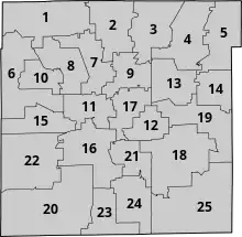 The Indianapolis City-County Council consists of 25 seats corresponding to 25 electoral districts apportioned by population throughout Marion County. Because the council is the legislative body for both the city and the county, residents of Marion County's four "excluded cities" (Beech Grove, Lawrence, Southport, and Speedway) are eligible to vote in council elections and are equally represented alongside Indianapolis residents.[7] Every seat is up for reelection every four years. The head of the council is the council president who is elected by the majority party at the council's first meeting in January.