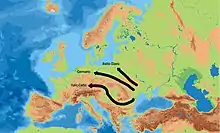Early migrations at ca. 4200 BCE brought steppe herders into the lower Danube valley, either causing or taking advantage of the collapse of Old Europe.[28] According to Anthony, the Anatolian branch,[29][30] to which the Hittites belong,[31] probably arrived in Anatolia from the Danube valley.[32][33][web 7][34][35][36]