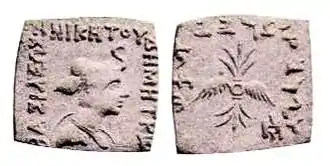 Coin depicting the Greco-Bactrian king Euthydemus 230–200 BC. The Greek inscription reads: ΒΑΣΙΛΕΩΣ ΕΥΘΥΔΗΜΟΥ – "(of) King Euthydemus".