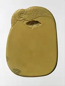 The device evolved from a rubbing tool used for rubbing dyes dating around 6000 to 7000 years ago.[1] The earliest excavated inkstone is dated from the 3rd century BC, and was discovered in a tomb located in modern Yunmeng, Hubei. Usage of the inkstone was popularized during the Han Dynasty.[2]