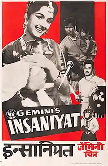 Insaniyat (transl. Humanity) is a 1955 Hindi-language action film produced and directed by S. S. Vasan. The film stars Dilip Kumar, Dev Anand and Bina Rai. The film's songs were written by Rajendra Krishan. The film's music is by C. Ramchandra. It is a remake of 1950 Telugu film Palletoori Pilla and is the only film to feature Dilip Kumar and Dev Anand together onscreen and stamped their presence in Indian Hindi Films for Decades there after. Insaniyat was a blockbuster at the box office.[1] The film also features a chimpanzee named Zippy whose camaraderie with Kumar was its main attraction.Amjad Khan (actor) made a short appearance as child artist in one of the song this film.