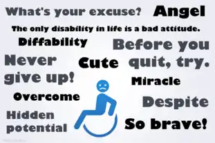 Inspiration porn is the portrayal of people with disabilities (or other uncommon life circumstances) as being inspirational to able-bodied people (or other common reference group), on the basis of their life circumstances.[1] The term "inspiration porn" is by analogy with pornography, in that the material is perceived as objectifying disabled people for the benefit or gratification of the able-bodied.[2][3] Inspiration porn may be seen as a form of ableism.[4] An example of inspiration porn might be photo of a child with a disability taking part in an ordinary activity, with captions targeted towards able-bodied people such as "your excuse is invalid", "before you quit, try" or "they didn't let their disability stop them".[1]