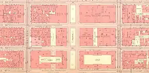 The InterContinental Barclay Hotel is at 111 East 48th Street, on the western side of Lexington Avenue between 48th and 49th Streets, in the Midtown Manhattan neighborhood of New York City.[2][3] It sits on the eastern portion of a city block bounded by Park Avenue to the west, 48th Street to the south, Lexington Avenue to the east, and 49th Street to the north.[4] The Barclay occupies a rectangular land lot with an area of 41,170 sq ft (3,825 m2).[5] The site has a frontage of 200 ft (61 m) on Lexington Avenue and 205 ft (62 m) on either side street.[5] When the Barclay was built in the 1920s, it adjoined Park Lane, a private driveway, to the west.[6][7]