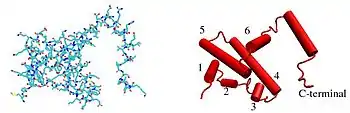 The IFN-γ monomer consists of a core of six α-helices and an extended unfolded sequence in the C-terminal region.[19][20] This is shown in the structural models below. The α-helices in the core of the structure are numbered 1 to 6.