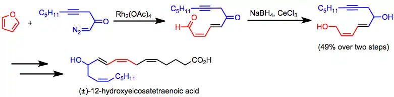 Enantioselective intermolecular cyclopropanation has been applied to the synthesis of the chiral cyclopropane antibiotics cilastatin.[24] (12) Tandem cyclopropanation/fragmentation is a key step in the synthesis of 12-hydroxyeicosatetraenoic acid.[25]