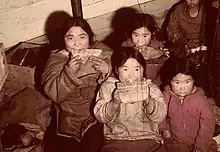 Children were taught at a young age to listen to their parents and respect their elders, and were treated with more autonomy than non-Inuit children.[17] Over disciplining a child was seen as counterproductive, so children were rarely punished for transgressions.[18] Learning was regarded as a partnership between child and adult, with children being more guided through life than directly taught or lectured.[19]