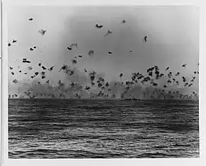 The plane sliced across the superstructure with its wing, collapsing it onto the flight deck, and then veered into her flight deck on the forward starboard side, releasing the two bombs, with one penetrating the flight deck and setting off a series of explosions among the fully gassed planes on the hangar deck. Pressure to her water main was lost when the second bomb passed through the hangar deck, making it more difficult to fight fires.[22] Fires and explosions, including the intense heat and dark smoke of an oil fire, continued until the decision was made to scuttle her with a torpedo later in the day.[23][24] Considered sunk by Naval statistics, her kamikaze strike, though coming early in the battle, represented the greatest loss of life to a single ship with 93 killed and 65 wounded.[25] 19 Grumman FM-2 Wildcat fighters and 10 Grumman TBM Avenger torpedo bombers went down with Ommaney Bay. None of her planes were able to take off before the attack.[26]