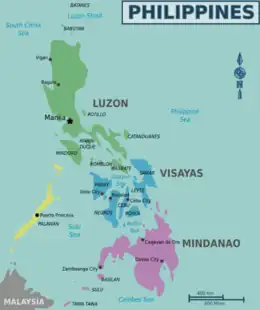 From January 3–9, 1945, the ships of Admiral Oldendorf's invasion force took a lengthy circuitous route through the previously captured islands of Leyte Gulf in the Southeast of the Philippines, shown in blue as the Eastern Visayas in the map at left, and West, South of the Southern Visayas through the Suriago Strait and the Bohol Sea. Then heading north and following the Western coastlines of the Western Philippine Islands of Negros, Panay, and Mindoro (In green), shown at left in the map, the forward staged ships of Admiral Oldendorf's naval invasion force headed for the mouth of Lingayen Gulf on the Island of Luzon, shown to the immediate left of Bagaio. From the mouth of the Gulf, two vertical channels would be swept of mines by the minesweepers, one for landing areas terminating at the base of the Gulf, west on the beach of Lingayen, and one for landing areas terminating east at the town of San Fabian. The narrow base of the roughly rectangular Lingayen Gulf provided a relatively small landing area, only 25–30 miles wide, but its assault forces needed to take only a 100-mile overland route South to reach Luzon's capital city of Manila, shown clearly at left.