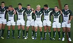 Ireland were included in the tournament held in England and were placed in Group B alongside Moldova and Morocco. Ireland beat Moldova 48–24 before beating Morocco 42–6 to progress to the final. In the final Ireland lost 6–22 to the Cook Islands at Gigg Lane in Bury.[10] Coached by Terry Flanagan, Ireland's squad included professionals Des Foy and Martin Crompton in an otherwise domestic based squad.