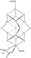 Iron–sulfur proteins are proteins characterized by the presence of iron–sulfur clusters containing sulfide-linked di-, tri-, and tetrairon centers in variable oxidation states. Iron–sulfur clusters are found in a variety of metalloproteins, such as the ferredoxins, as well as NADH dehydrogenase, hydrogenases, coenzyme Q – cytochrome c reductase, succinate – coenzyme Q reductase and nitrogenase.[1] Iron–sulfur clusters are best known for their role in the oxidation-reduction reactions of electron transport in mitochondria and chloroplasts. Both Complex I and Complex II of oxidative phosphorylation have multiple Fe–S clusters. They have many other functions including catalysis as illustrated by aconitase, generation of radicals as illustrated by SAM-dependent enzymes, and as sulfur donors in the biosynthesis of lipoic acid and biotin. Additionally, some Fe–S proteins regulate gene expression. Fe–S proteins are vulnerable to attack by biogenic nitric oxide, forming dinitrosyl iron complexes. In most Fe–S proteins, the terminal ligands on Fe are thiolate, but exceptions exist.[2]