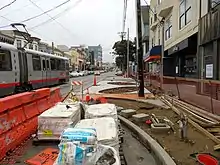 In March 2014, Muni released details of the proposed implementation of their Transit Effectiveness Project (later rebranded MuniForward), which included a variety of stop changes for the N Judah line. The stop locations at Irving and 9th Avenue were to be moved to the far side of the intersection (to allow trains to pass through before stopping) and transit bulbs constructed to allow passengers to board directly from the sidewalk.[4] The eastbound bulb would be adjacent to 8th Avenue, and the westbound bulb north of the existing bus stop, to allow trains to fully clear the intersection before opening their doors.[2]