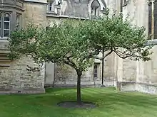 There are several genetically identical trees, or clones, of the original apple tree that have been planted around the world. Trinity College in Cambridge, Newton's alma mater, hosts a genetically identical tree, growing outside the main gate of the college below the room Newton lived in when he studied there.[17][39][40] Woolsthorpe Manor gifted five cuttings from Newton's Apple Tree to Loughborough University, located near Newton's childhood home. These cuttings were planted at Loughborough University as part of an initiative to inspire students to think like Isaac Newton.[41] Cambridge University Botanic Garden had a clone of Newton's Apple Tree that stood at the Brookside entrance. Unfortunately, it fell during Storm Eunice.[42] Yet, the garden plans to plant a new clone elsewhere on the premises.[43] National Institute of Standards and Technology (NIST), Gaithersburg campus in the United States had a clone of Newton's Apple Tree planted.[44][20] But it fell over and died in June 2023 due to unknown reasons.[44][45]