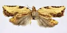 The wingspan is 17.5–22 mm for males and 19–27 mm for females. The head, antenna and labial palpus are yellow, scattered with ochreous. The thorax and tegula are ochreous brown tinged with yellow. The forewing is broad, nearly rectangular and the apex is slightly protruding anteriorly. The ground color is yellow, with scattered pale ochreous scales medially, densely covered with ochreous brown scales along the dorsal area. The markings are ochreous brown with sparse brownish black scales: the costal margin with two dots near the base and a triangular spot. The median fascia are interrupted or indistinct medially. There is a faint pale ochreous yellow stripe running from below the costal portion of the median fascia to the termen below the apex, gradually narrowing. There is a subapical blotch running from the middle of the costal margin to before the apex. It is narrowly stripe-shaped, with brownish black and yellow dots along the costal margin. The cilia are ochreous mixed with brownish black, but yellow at the apex. The hindwings are pale grayish brown, distally with a large yellow patch tinged with sparse pale ochreous brown scales. The cilia is pale grayish brown. The legs are pale yellow, mixed with brownish black on the ventral side of the foreleg. The outer side of the mid- and hindlegs is yellow, tinged with brownish black. The abdomen is grayish brown.