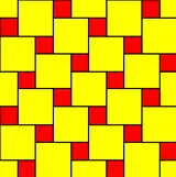 | The Pythagorean tiling has 2 square types (sizes). | This 3-uniform tiling has 3 triangle types, with same shape, and 1 square type. | The herringbone pattern has 1 rectangle type. | This pentagonal tiling has 3 irregular pentagon types, with same shape. |