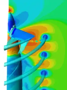 Isosurface of vorticity trailed from a propeller blade. Note that this is an isosurface plotted with a colormapped slice.