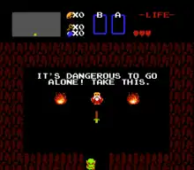 "It's dangerous to go alone! Take this." is a quote from the 1986 video game The Legend of Zelda.[nb 1] It is spoken by an unnamed old man, met in the cave at the start of the game, who gives the player-character Link a sword to aid his quest to defeat Ganon and rescue Princess Zelda. The quote has been referenced in video gaming and other media, has become an Internet meme, and has been established in pop culture.
