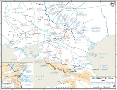 On 13 August, the Italian 8th Army reached its assigned sector on the Don on the left flank of the 6th Army's XVII Corps. The Italians had to defend a 270-kilometre front along the right bank of the Don.[10]