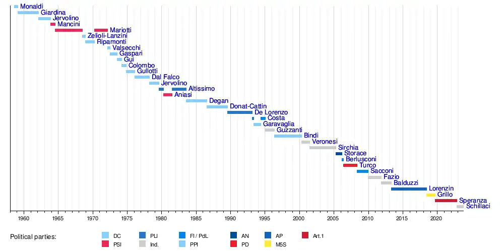 22 October 2022 | Incumbent | 1 year, 4 days | Independent | Meloni | [60] | ||