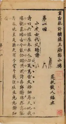 Yu Jiao Li is one of the best-known caizi jiaren novels,[1] together with Ping Shan Leng Yan, and Haoqiu zhuan.[2] The English version published by Hunt and Clarke of London in 1827 is an adaptation of Jean-Pierre Abel-Rémusat's French translation.[3]