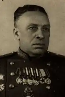In response to a petition from the 3rd Ukrainian Front Military Council, the Military Collegium of the Supreme Court rehabilitated Kosobutsky on 30 October 1943, expunged his sentence, and restored him to the rank of major general.[7] However, his party membership was not restored.[8] In October 1943, Kosobutsky took command of the 34th Rifle Corps of the 1st Guards Army of the 3rd Ukrainian Front. He led the corps for the rest of the war, during which it was transferred to the 46th, 57th Army, and 37th Armies. During this period, the corps took part in the Battle of the Dnieper, the Nikopol–Krivoi Rog Offensive, the Bereznegovatoye–Snigirevka offensive, the Odessa Offensive, and the Second Jassy–Kishinev offensive. In these operations, Kosobutsky's corps took Dnepropetrovsk, Krivoi Rog, Shumen, and Constanța. For his performance in the Nikopol–Krivoi Rog Offensive, 46th Army commander Vasily Glagolev recommended Kosobutsky for the Order of Bogdan Khmelnitsky, 2nd class, which was upgraded to the Order of Suvorov, 2nd class and awarded on 19 March 1944. The citation read:[8]
