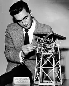 ![]() Iwo Pogonowski with model for his design of a hexagonal-base oil platform | |