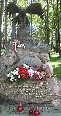 In 1941 "Orzeł" became the leader of a local partisan unit "Konfederacja Tatrzańska" (Tatra Confederation, KT), associated with the pre-war agrarian People's Party (SL). In June 1943, he murdered two plain clothes policemen[5] and in response, on 29 June 1943, the Germans carried out a "pacification" of Waksmund and murdered his father, his wife, his two-year-old son, sent his two brothers to a concentration camp and burned his house. After this, Kuraś changed his pseudonym to "Ogień" (Fire).