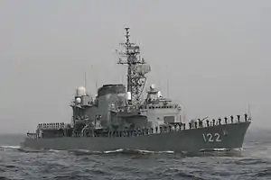 This is the first destroyer class in the JMSDF equipped with the Sea Sparrow Improved basic point defense missile system. The IBPDMS of this class uses FCS-2 fire-control systems of Japanese make and one octuple launcher at the afterdeck. And in the JMSDF, OTO Melara 76 mm compact gun and Boeing Harpoon surface-to-surface missile are adopted from the ship of FY1977 including this class. Also, ships built in FY1979 and beyond carried Phalanx CIWS and were retrofitted to previous ships.[1]