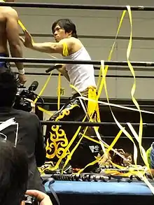 Kudo returned from his injury on August 28, 2016, at Ryogoku Peter Pan 2016, wrestling in a tag team match, where he and Masahiro Takanashi defeated Akito and Yasu Urano.[162] Kudo won his first title since his return on December 11, when he, Takanashi and Sakaguchi defeated Damnation (Daisuke Sasaki, Mad Paulie and Tetsuya Endo) for the KO-D 6-Man Tag Team Championship.[163] They lost the title to Kazusada Higuchi, Kouki Iwasaki and Mizuki Watase in a three-way match, also involving Antonio Honda, Konosuke Takeshita and Trans-Am★Hiroshi, on January 22, 2017.[164] Kudo, Takanashi and Sakaguchi won the KO-D 6-Man Tag Team Championship for a record-tying sixth time on June 25, 2017, by defeating NωA (Makoto Oishi, Mao and Shunma Katsumata).[165][166] They were stripped of the title on October 10, when Kudo was sidelined with a concussion.[167] Following Kudo's return, Shuten-dōji won the title for the seventh time by defeating All Out (Akito, Diego and Konosuke Takeshita) on December 10.[168]