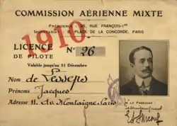 Jacques Benjamin de Lesseps was a French aviator born in Paris on 5 July 1883, killed in an air accident presumably on 18 October 1927 along with his flight engineer Theodor Chichenko. He was the son of French diplomat Ferdinand de Lesseps. In 1910 he married Grace Mackenzie, daughter of Sir Willam Mackenzie.