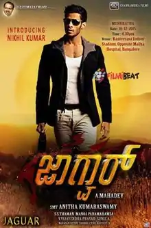 Jaguar is a 2016 Indian vigilante action film, produced by H. D. Kumaraswamy[5] under his banner Channambika Films and directed by Mahadev. Shot simultaneously in Kannada and Telugu, it features Nikhil Gowda, who is the son of the producer H. D. Kumaraswamy, and Deepti Sati in the lead roles, while Tamannaah made a cameo appearance with this film, thus marking her debut in Kannada cinema. The music was composed by S. Thaman, and action sequences were choreographed by Ram-Lakshman.[6][7][8]