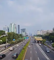 Jakarta lies in a low and flat alluvial plain, ranging from −2 to 91 m (−7 to 299 ft) with an average elevation of 8 m (26 ft) above sea level with historically extensive swampy areas. Some parts of the city have been constructed on reclaimed tidal flats that occur around the area.[48] Thirteen rivers flow through Jakarta. They are Ciliwung River, Kalibaru, Pesanggrahan, Cipinang, Angke River, Maja, Mookervart, Krukut, Buaran, West Tarum, Cakung, Petukangan, Sunter River and Grogol River.[49][50] They flow from the Puncak highlands to the south of the city, then across the city northwards towards the Java Sea. The Ciliwung River divides the city into the western and eastern districts.