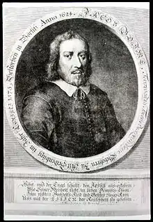 Böhme left for Dresden on 8 or 9 May 1624, where he stayed with the court physician for two months. In Dresden he was accepted by the nobility and high clergy. His intellect was also recognized by the professors of Dresden, who in a hearing in May 1624, encouraged Böhme to go home to his family in Görlitz.[7] During Böhme's absence his family had suffered due to the Thirty Years' War.[7]