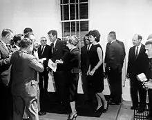 - "President John Kennedy gets a preview of United Press International photographer James Atherton's picture portfolio that won first prize in the annual White House Photographers Association Photo Contest". Getty Images. 1962.