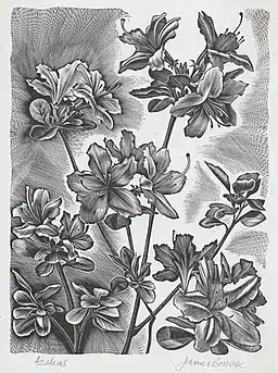 For over thirty years James Bostock combined an artistic career with that of a full-time teacher and administrator. Notwithstanding his academic commitments, as well as the inevitable demands of bringing up a family of three boys, Bostock produced a remarkable oeuvre of paintings and prints. However, it was not until retirement in 1978, and a resultant flurry of artistic activity, that James Bostock's work came before a wider audience. His work is to be found in the British Museum, the Victoria and Albert Museum, the British Council collection, the Hunt Botanical Library, Pittsburgh and many private collections[5]