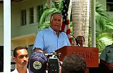 In June 1992, trailing George H. W. Bush and Ross Perot in the polls, Clinton limped toward the national convention, while the Los Angeles riots crowded him out of news coverage.[67] Carville knew he needed to bring Clinton back into the news limelight. He did so by orchestrating Clinton's splashy criticism of hip hop artist Sister Souljah in a prepared speech Clinton delivered at the Rainbow Coalition's June 1992 "Rebuild America" conference in Washington, D.C.[68] Sister Souljah had remarked: "If black people kill black people every day, why not have a week and kill white people?" Clinton responded in his speech by saying, "If you took the words, 'white' and 'black' and you reversed them, you might think David Duke was giving that speech." Clinton refuted the suggestion that his speech was a calculated attempt to appeal to moderate and conservative swing voters by standing up to a core Democratic constituency.[69] The speech had the effect of opening up a public war between Clinton and Jesse Jackson.[70]