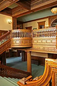 The interior features an art gallery that housed Hill's collection of painting and sculpture. It even had a pipe organ, installed after someone suggested to Hill that other wealthy people had pipe organs in their homes. The house had a hybrid system of gas and electric lighting, with rotary switches on the walls to turn on the electric lights. However, there were no electrical outlets installed, because during that era electricity was only used for lighting. The woodwork in the house is very intricate, with hand-carved woodworking in the central hallway, the formal dining room, and the music room. Other rooms in the house, particularly on the second floor where most of the family members lived, do not have hand carved woodwork, but the woodwork is still richly colored and nicely detailed.
