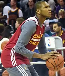 On July 25, 2015, Jones re-signed with the Cavaliers.[42] In a December 2015 article on ESPN.com by Dave McMenamin, LeBron James said "He's my favorite player of all time" and "He's the greatest teammate I've ever had" in regards to Jones.[40][43] The Cavaliers won the Eastern Conference championship for the second year in a row and went on to win the 2016 NBA championship, becoming the first team in history to win the championship after being down 3–1 in the Finals, as Jones won his third title in five years.[44][45] He played in 48 games during the 2015–16 season while averaging 3.7 points, 1.0 rebounds and 9.6 minutes a game.[34] He was a DNP-CD for 34 games.[38] He was also one of twelve players nominated for the Twyman–Stokes Teammate of the Year Award, finishing tenth place in the voting.[46] On June 26, 2016, Cavaliers teammate Kevin Love called Jones "the best teammate I've ever had".[47][48]