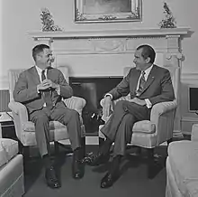 In the spring of 1974, with the Watergate scandal continuing to grow in magnitude and seriousness, Buckley surprised and, in some cases, angered some of his allies among Republicans when he called upon the increasingly-embattled Richard M. Nixon to voluntarily resign the presidency.[39] Buckley said that in doing so, he was making no judgment as to Nixon's technical legal guilt or innocence of the accusations made against him and in fact denounced those "in and out of the media who have been exploiting the Watergate affair so recklessly" in what he called an effort "to subvert the decisive mandate of the 1972 election." However, he said that the burgeoning scandal might result in an impeachment process that would tear the country even further apart and so he declared: "There is one way and one way only by which the crisis can be resolved, and the country pulled out of the Watergate swamp. I propose an extraordinary act of statesmanship and courage—an act at once noble and heartbreaking; at once serving the greater interests of the nation, the institution of the Presidency, and the stated goals for which he so successfully campaigned"—Nixon's resignation.[40] Buckley was the first major conservative figure to call for resignation. Nixon did not resign at that time but eventually did lose the support of key Republican figures, including Senator Barry Goldwater.[41] Nixon ultimately resigned on August 9, 1974.[42]