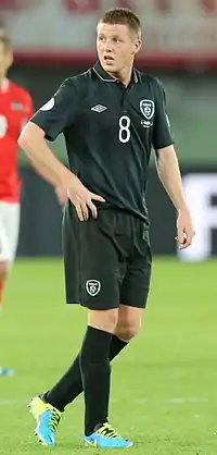 McCarthy received his first call-up to the Republic of Ireland national squad in February 2010, for a friendly with Brazil played in London.[45] He made his debut as a substitute, replacing Stoke City's Liam Lawrence after 70 minutes.[46] McCarthy withdrew from the Ireland squad for their 2011 Nations Cup match against Wales.[47] This led to media speculation that McCarthy may switch his allegiance to Scotland, as his appearance in the friendly against Brazil did not tie him to Ireland under the present rules.[48] The speculation was fuelled by Wigan manager Roberto Martínez who insisted that McCarthy was still considering his international future, even after McCarthy and Giovanni Trapattoni had a face to face meeting in which McCarthy reportedly confirmed his commitment to Ireland.[49]