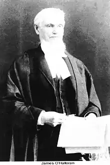 James O'Halloran, KC (c.1820 – June 1, 1913) was a Quebec lawyer and political figure. He was born about 1820 (some sources say 1821) near Fermoy, County Cork, Ireland and came to Canada with his family in 1828. He studied at the University of Vermont and served in the U.S. Army during the war with Mexico. He returned to Lower Canada in 1849, was admitted to the bar in 1852 and set up practice in Cowansville. He was elected to the Legislative Assembly of the Province of Canada for Missisquoi as a member of the parti rouge; he was reelected in 1863. He opposed Confederation. O'Halloran was named Queen's Counsel on February 12, 1864.