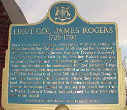 In the American War of Independence, he commanded the 2nd Battalion of the King's Rangers, thereby forfeiting his lands in Vermont. In 1784, he led a party of about 300 disbanded King's Rangers and their families to the Third Township of Cataraqui, later known as the Township of Fredericksburgh, in Lennox County, Ontario, where they were granted land.[4] Rogers, who first settled in Fredericksburgh, where he became lieutenant-colonel of the militia, lived for a time in Prince Edward County, Ontario but returned to Fredericksburgh before his death on September 23, 1790.[3]