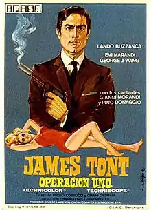 James Tont operazione U.N.O. or Operation Goldsinger is a 1965 French/Italian international co-production Eurospy film spoof based on James Bond's Goldfinger.[1] Co-written and co-directed by Bruno Corbucci and Giovanni Grimaldi, the film stars Lando Buzzanca as James Tont Agent 007 1⁄2 a parody of James Bond and Loris Gizzi as Erik Goldsinger, a parody of Auric Goldfinger. It was followed by James Tont operazione D.U.E..