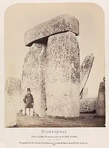 Waterhouse may well have first learnt photography during his time at Addiscombe, where the subject had formed part of the curriculum since the mid-1850s and while stationed in Meerut in 1859 he acquired his first camera, 'a half-plate set made of the good old French walnut wood ... [which] ... stood the hot dry climate wonderfully well'.[2] His first serious photographic expedition appears to have been made in 1861 in the company of a fellow officer, Boyce Edward Gowan, with whom he made the first recorded photographs of the ruined Buddhist stupa and monastery at Sanchi, near the holy Hindu city of Vidisha. In June 1861, an official circular issued under the authority of the Governor-General Lord Canning, was sent out encouraging military officers and others to collect photographs of ethnic and tribal types and in December 1861 Waterhouse was officially seconded to undertake a photographic tour of Central India (present-day Madhya Pradesh) for this purpose. This work occupied him for the whole of 1862 and involved a series of strenuous trips in Central India in search of suitable subjects: the best-known of this work is the series of portraits made of Sikandar Begum of Bhopal, her family and courtiers, taken in November of that year.[3] A selection of these portraits was later included in John Forbes Watson and John William Kaye, The People of India (8 vols., India Museum, London, 1868–75), while views taken at Sanchi during the trip were used by the architectural historian James Fergusson in his Tree and Serpent Worship (India Museum, London, 1868).