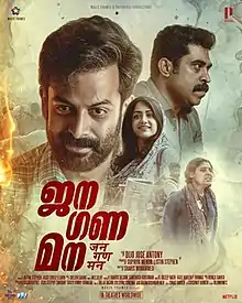 Jana Gana Mana (transl. The Minds of All People) is a 2022 Indian Malayalam-language legal thriller film directed by Dijo Jose Antony and starring Prithviraj Sukumaran, Suraj Venjaramoodu, Pasupathi Raj, G. M. Sundar, Mamta Mohandas, Sri Divya. The music was composed by Jakes Bejoy with cinematography by Sudeep Elamon and editing by Sreejith Sarang. The film released on 28 April 2022[3] to positive reviews for its narrative style, cast performances, and technical aspects.[4]