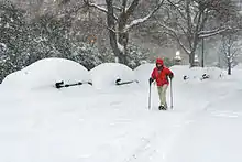 New York City mayor Bill de Blasio declared a hazardous travel advisory for the city, encouraging people not to travel; however, he did not ban traveling.[66] On January 22, he declared a "winter weather emergency" and told residents to "Get done what you have to get done today ... Do not bring your vehicle out tomorrow".[67] Taking place a year after a storm prompted the closure of the city's subway system in January 2015, only to largely bypass the city, Governor Andrew Cuomo stated that services would remain running.[62] Approximately 1,800 workers equipped with 800 heaters were to keep rails clear for use.[38] Thousands of sanitation workers, 1,700 plows, and 150,000 tons of road salt were on standby to clear city roads.[38][62] He also put 600 members of the New York National Guard on standby.[67] More than 50 power workers from Vermont were dispatched to Long Island to help restore power outages.[68] Around noon on January 23, owing to a significant increase in expected snowfall, Cuomo issued a travel ban for all roads in New York City and Long Island. The New York City Transit Authority suspended bus service; rail service on the Long Island Rail Road, Metro-North, and Staten Island Railway; and elevated subway service (with underground subway lines remaining open until further notice). In the meantime, the Port Authority of New York and New Jersey closed bridges and tunnels in the region.[69] The New Jersey Transit was also shut down in preparation of the blizzard.[70]
