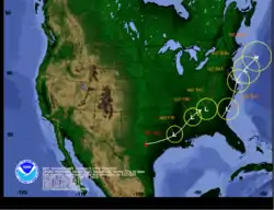 The development of the winter storm was anticipated by forecasters for at least a week.[16] It originated in a shortwave trough—a weather disturbance in the upper atmosphere—that came ashore at the Pacific Northwest on January 19.[17] The trough strengthened as it moved southeastward through the Great Plains,[18] and on January 21 it spawned a weak low-pressure area over central Texas.[19] The incipient storm system began to intensify as it tracked eastward through the Gulf Coast states, triggering a line of strong to severe thunderstorms and multiple tornado warnings.[20]