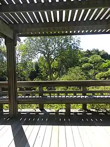 The garden was designed by Kimio Kimura.[2] It follows Japanese garden design principles, using California native stone and plants. [1] The garden contains over 70 plant species including mondo grasses, Japanese black pine, cedar, juniper, and rhododendron.[2] No stains were used on the wood constructions.[1] Nails and fasteners are recessed, and all wood was notched, and aged, to simulate the appearance of a traditional Japanese garden.[1]