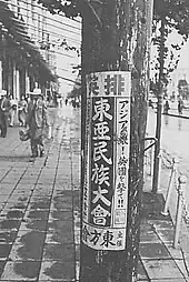 Short wave radios were used to broadcast anti-European propaganda to Southeast Asia even before the war.[38] Japan, fearful of foreign propaganda, had banned such receivers for Japanese, but built broadcasters for all the occupied countries to extol the benefits of Japanese rule and attack Europeans.[39] "Singing towers" or "singing trees" had loudspeakers on them to spread the broadcasts.[40]