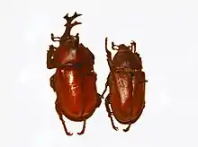 Allomyrina dichotoma shows a striking sexual dimorphism. The males are much larger, reaching a length of 40–80 mm, while females can reach a length of about 40–60 mm. The long cephalic horn of this species has a characteristic shape in the form of the letter Y and it is used by males during the mating period and to maintain territories.[2] By means of their forked horn they lift other males off the ground and throw them into the air.[2] In addition to their impressive and ornate protuberance they also have a smaller thoracic horn, also forked. Their eyes may be white or red and are adapted to low light levels, as this species is nocturnal.[2] The body is dark brown, while the ventral part of the body is black and brilliant and the front legs are unusually long. Like all Dynastinae species, these beetles are strong flyers,[2] although they never cover long distances during the flight.