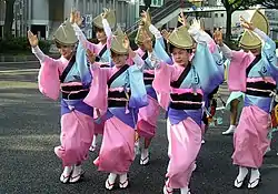 Japanese traditional dance describes a number of Japanese dance styles with a long history and prescribed method of performance. Some of the oldest forms of traditional Japanese dance may be among those transmitted through the kagura tradition, or folk dances relating to food producing activities such as planting rice (dengaku) and fishing, including rain dances.[1] There are large number of these traditional dances, which are often subfixed -odori, -asobi, and -mai, and may be specific to a region or village.[1] Mai and odori are the two main groups of Japanese dances, and the term buyō (舞踊) was coined in modern times as a general term for dance, by combining mai (舞) (which can also be pronounced bu) and odori (踊) (which can also be pronounced yō).[2]